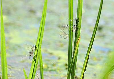 溜池は夏のトンボがすっかり姿を消しひっそりしている。そんな中、ミクリの葉でアオイトトンボの交尾と産卵が行なわれていた。写真左が交尾中のペアー、右の2ペアーは葉に卵を産みつけている最中 このトンボ見ているとどうもお互い近くに集まって交尾・産卵する習性があるようだ。