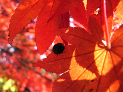近畿地方の「木枯らし1号」は11月2日でした。 このカエデは今が紅葉の見ごろです。 誘われてかテントウムシがいました。 まもなく、このカエデの葉は、後を冬芽に託して 散り落ちることでしょう。 テントウムシ(天道虫)は日溜まりを追いかけて 冬を乗りきることでしょう。