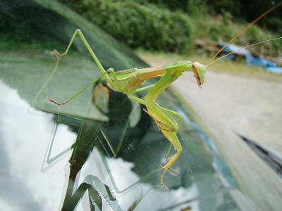 車のフロントガラスにくっついたまま、 約1kmほどカマキリを乗せたまま ドライブしました。 時速50kmでも振り落とされませんでした。