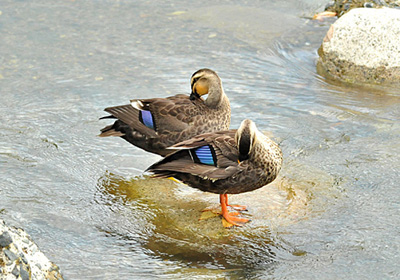 橋から下を覗くとカルガモが2羽くつろいでいた。近くにはこれまで見なかった数羽のカルガモとコガモがいたので、渡って来たばかりの個体のようだ。次列風切付近の青い翼鏡(よくきょう)が鮮やかに見えている。