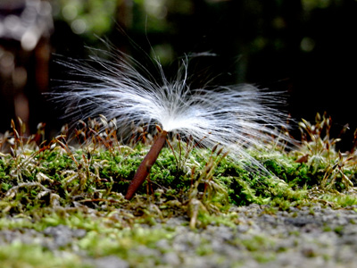 気温5.3度、北風が強く寒い日でした。 空中を舞い飛ぶテイカカズラ(キョウチクトウ科、定家葛)の 種子が数多く観察されました。 この種子の落着いた所は苔の上、きっと、ここを適地とし、 絹毛は役目を終え、種子は活動スタート、発芽の場所と 定めることでしょう。