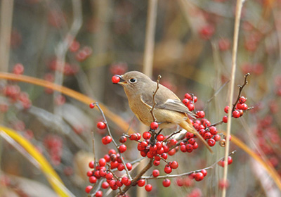 写真の場所は植木畑が放置されたところで雑草に覆われ、植えられていたウメモドキの赤い実が雑草の中から辛うじて顔を出していた。 この実はメジロ、ヒヨドリがよく食べているが、今年は各種の実が豊富で、まだここには来ていないようだ。 この日はジョウビタキの雌が数個食べて飛んで行った。