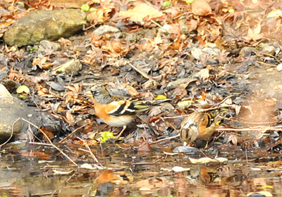 群のアトリのうちの10羽ほどが溜池の淵で水を飲んでいた。周りを警戒しながら飲んでいて人影があると一斉に上の樹に避難する。写真右の個体は頭頂に2本の黒褐色斑があり雌で、左の個体は眼の周りが黒っぽいので雄ではないか。