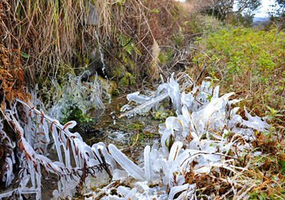 上の畑から滴り落ちる水飛沫が半径50cmほどの周辺の枯れ草に飛び連日の深夜の冷え込みで凍り、まるで氷の花である。ここは土手で遮られ昼間も日が当らないところで見るたびに氷が太くなっていた。
