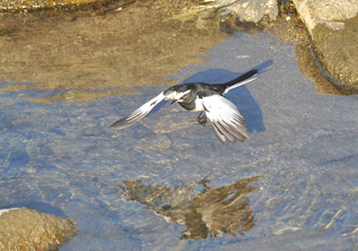 余野川の川原ではハクセキレイ、キセキレイ、タヒバリ、それとセグロセキレイといったセキレイの仲間が活動していた。採食活動は終わったのかセグロセキレイが羽づくろいしたり、水を飲んだりしていた。さらに岩から岩へ度々飛び移る行動が見られ、餌を採っているようには見えず、いったい何をしているのか判らない。