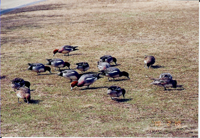 千里北公園の蓮間池にヒドリガモ・キンクロハジロ・ホシハジロ・オオバンなどが飛来している。 人の気配がないときにはヒドリガモだけが、陸に上がってきて。芝の中で採食に夢中になっている。人が近づいても逃げる気配はない。
