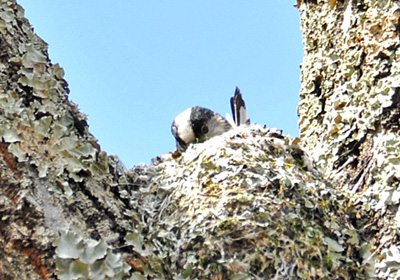 2月25日に見つけたエナガの巣作りがこのところの雨で気がかりだったが、この日見に行くと巣作りは順調に進んでいるようだった。巣作りに参加しているのは4、5羽と思われ巣材を持って帰るのはバラバラではなくだいたい一斉に帰って来る。巣は狭いので同時に作業が出来るのは2羽までで、それ以上帰って来た場合は先着のエナガの作業が終わるまで近くの枝で待機している。巣の上の部分を作っているので完成は間近だと思われるがまだ産座の羽毛はまだ運んでいない。 撮影者:横田 靖 さん 撮影場所:池田市伏尾町(2010.3.8.) 目次へもどる / 次の写真へ |