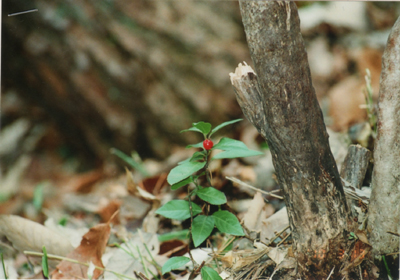 紫金山公園の林床のあちこちでヤブコウジが落ち葉に隠れるように見られた。 中にはまだかわいい赤い実をつけたものもあり、林床に色どりを添えていた。