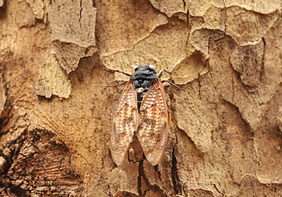アメリカスズカケノキにアブラゼミがとまっているではないか、一瞬驚いたがよく見ると動かない。眼も白くなっていてどうやらミイラ化した遺がいのよう。少し離れてみると生きているようで夏の終わりに死んだとしても6ケ月ほど経過していることになる。よくも残ったものだ。
