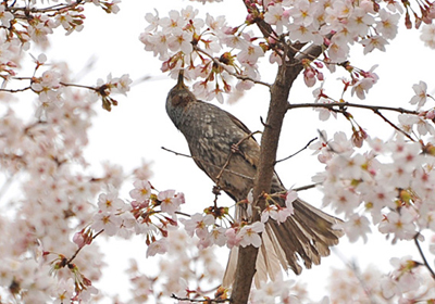 満開のソメイヨシノにヒヨドリが群がって蜜を吸っていた。普段警戒心が強いヒヨドリも吸蜜中は少し警戒心が緩む。メジロよりも図体の大きいヒヨドリが同じように僅かな蜜を吸っているのはちょっと滑稽に見える。この時期のヒヨドリを見ると嘴の基部が黄色くなっているのがよく見られるがこれは花粉が付いているのである。
