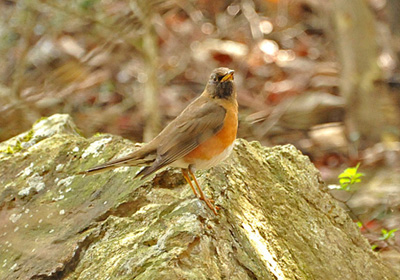明るい雑木林の林床を飛び跳ねるようにして餌を探している当地ではめったに見られないアカハラに出遭った。本種は近畿地方では場所により冬鳥か留鳥だが当地ではこの時期に見られる通過鳥。