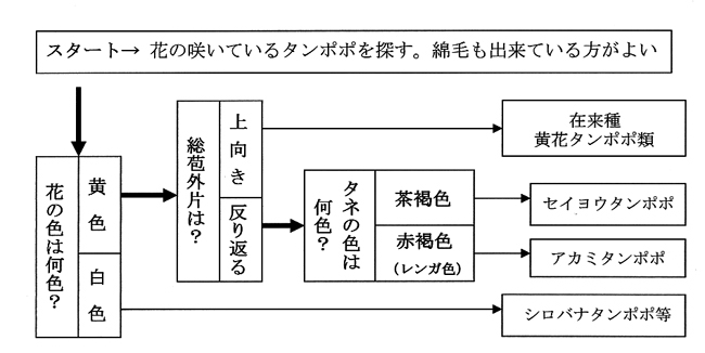 古くから日本にある在来種と、ヨーロッパ原産の外来種(帰化種)とは、どこで見分けられるのだろうか? 花弁の下にある緑色をした総苞の外片に注目すれば簡単にわかります。 近畿地方に分布する在来種のタンポポは詳しく調べると数種類(後の資料参照)に分けられますが、今回の調査では花弁の色に注目して、大きく2種類に分けて調査します。また、外来種は2種類ありますが、タネ(痩果)がないと区別がむつかしいので、タネがない場合は外来種としてまとめ、タネがある場合にのみ2種類に分けて報告してください。 *近畿地方に分布するタンポポ類の簡単な見分け方* ![]()