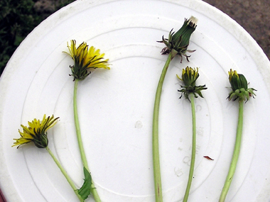| 木村コメント: これらのタンポポの写真は、今回のタンポポ調査の段階でいうと、写真Aは左から4・3・2・2・1となり、写真Bは左から1・2・3・3・4になると思います。 また、実物とその花粉を観察していないので断定できませんが、写真を見る限りでは、写真Aの段階1(右端)のものは頭花も小さく「カンサイタンポポ」と思われますが、写真Bの段階1(左端)のものは、在来種型の雑種のように見えます。ぜひ頭花をお送りください。 堺市での私の観察では、段階2のものが見つかるとその近くに段階2〜3のタイプのものがいっしょに見つかることが多く、これらはたぶん同じ個体から由来するものだと思います。 なお、都心部では(在来種と接触する機会が少ないためか?)段階4・5のようなものが多く、河内長野のように周辺が在来種の生育地に、新しく外来種が侵入したような地域で段階2・3のようなタイプが多いようです。このようなタイプのタンポポの花を見つけられて、同じ株に痩果(タネ)もできておれば、ぜひいっしょにお送りください。 |