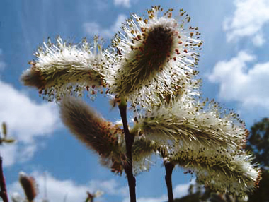 白く輝く綿毛のネコヤナギは早春のシンボルですが、満開の花姿もきれいです。 ますます暖かくなってきた日差しに、赤い葯を順々に開いて黄色い花粉をつけます。 花の周りをアブが飛び舞っていました。