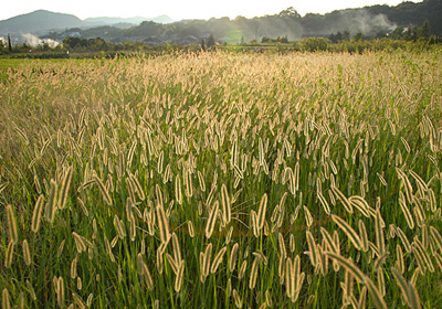 放置された畑一面にキンエノコロが群生、まるで今は見なくなった麦畑のよう。そのキンエノコロがまさに沈もうとする夕日を浴びて金色に輝いている。