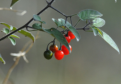 いつも通る畦で咲いている草花を何気なしに見ていたのでイヌホオズキかと思っていたが、この日見ると実が赤くなっていたのでヒヨドリジョウゴだと気がつく。