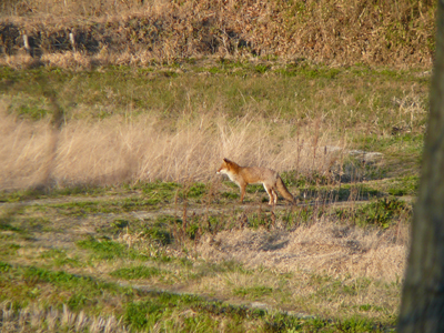 大和郡山市の西北部、矢田町に県立大和民俗公園があります。夕方ジョギングや愛犬のお散歩をする人たちが途絶えた一瞬、キツネがトコトコ現れました。公園の北に隣接する造園業の村から来るようです。 古い民家を保存している公園ですが、周囲には「少年自然の家」のキャンプ場や養鶏場の跡地などもあって、彼らの獲物もいるのでしょう。 ※他にも写真があります。こちら(野山のたより 2010年5月)もご覧ください。