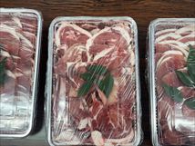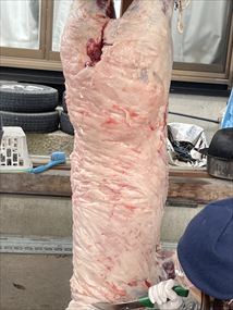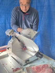 猪肉をスライサーでカットする作業に参加しました。 画面にタップで閲覧注意!! 3月に捕れたシシ1匹目です。85キロ程の♂、「3月のオスは餌を食べないでうろつきまわっていて脂肪がまったく無い」という猟師の話でした。↓スライスした肉をみんなで山分け、狩猟に協力してくれた方々に配ります。