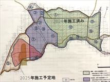 三草山では3ヵ年計画で大々的な防鹿柵設置が進められています。24、25年度作業が終わり、来年度、紫色の部分が予定されています。画面にタップで25年度施工の柵の点検作業をしています。このあと26年度の設置位置を決め距離を測りましたが傾斜がきつくて設置作業が難航しそうです。 |