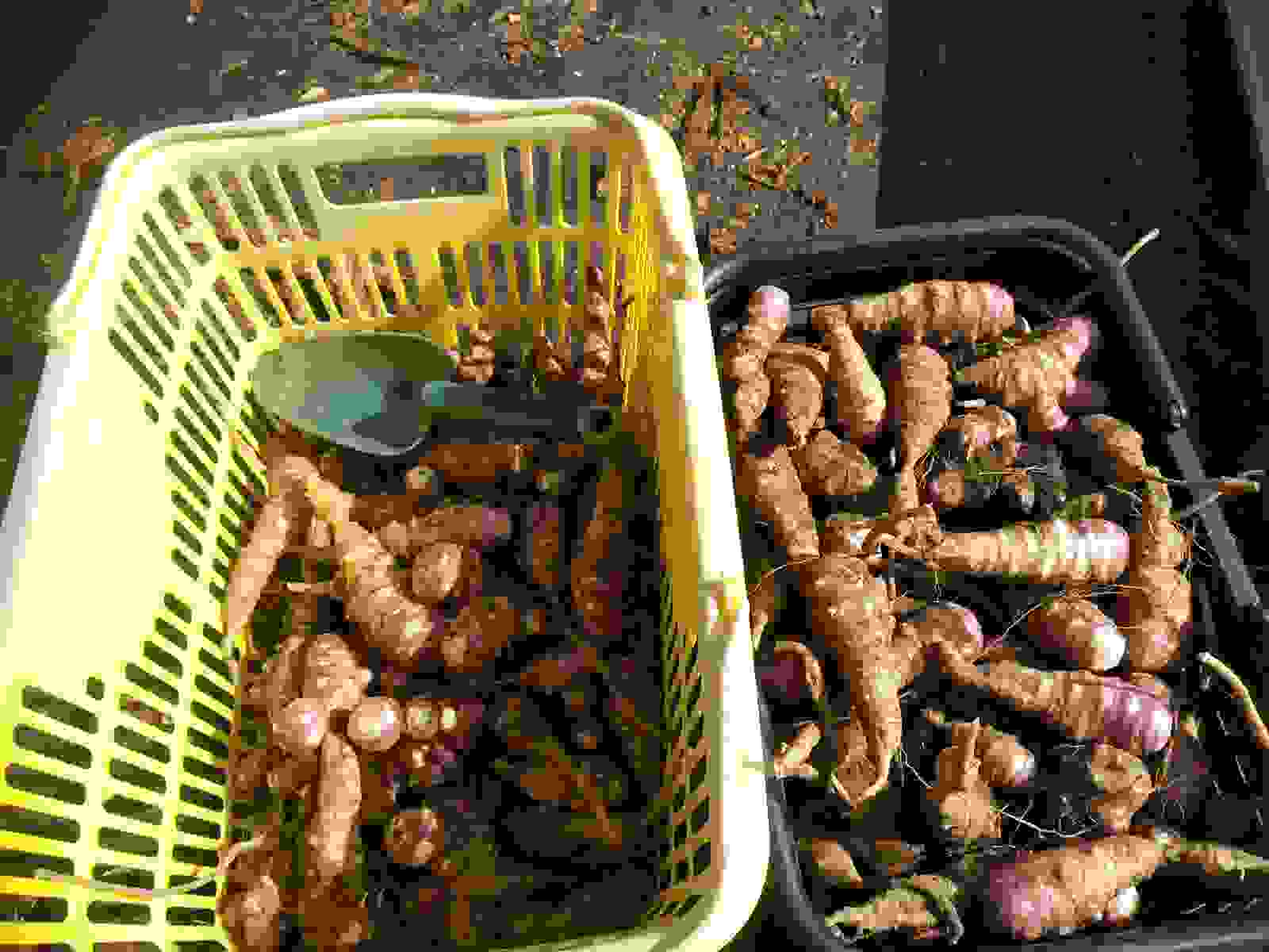 この春植えたキクイモの収穫です。5つの種イモから11kgのキクイモが収穫出来ました。体に良い成分が満載だそうです。 |