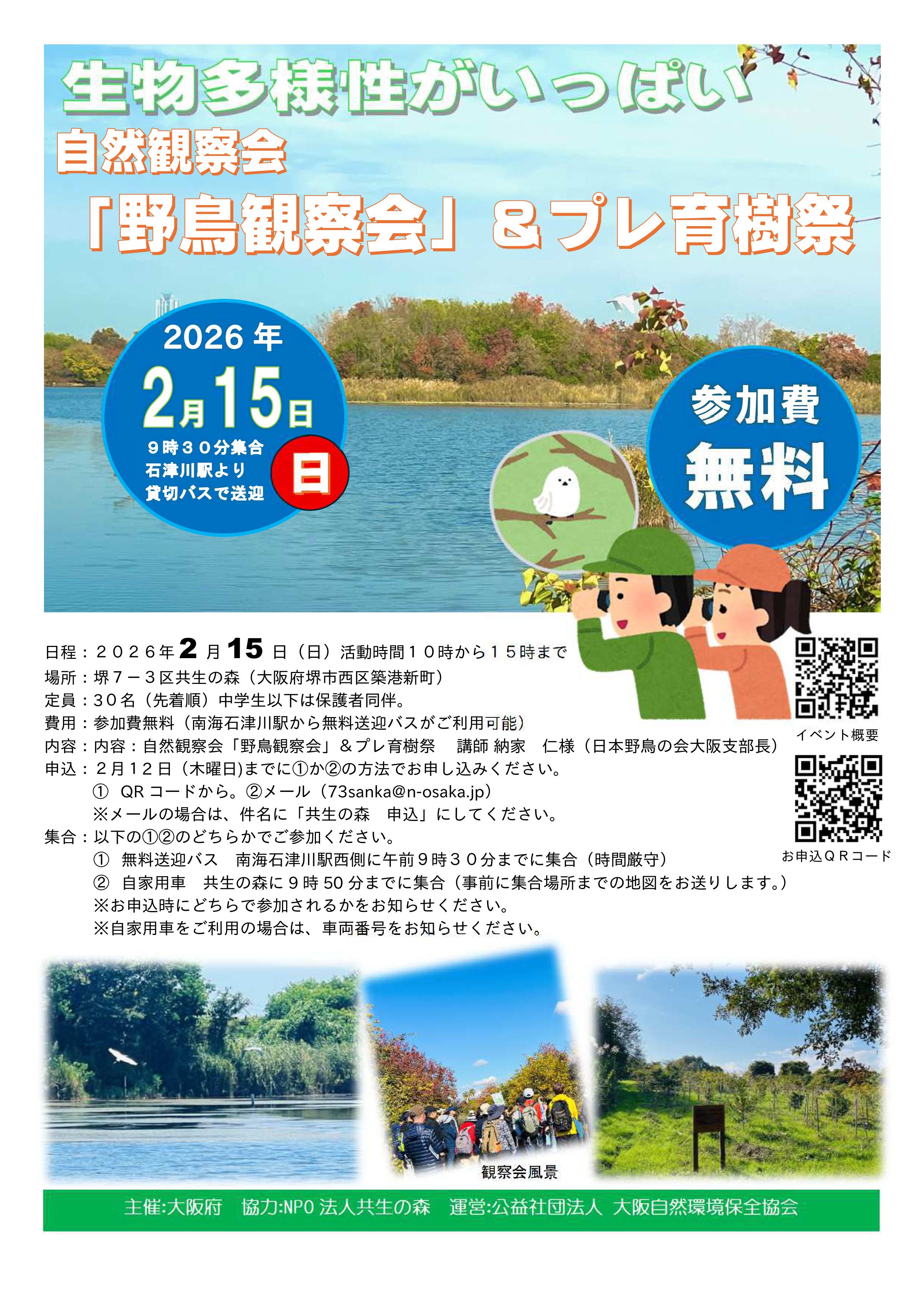 73sanka@n-osaka.jp まで件名「共生の森 申込」として、代表者、メールアドレス、日中連絡が取れる電話番号、共生の森までの利用交通機関(バス・自家用車)、お車で参加の場合は車両番号 (例:大阪500かXX-XX)、傷害保険をかけますので代表者含め当日参加者ごとの「お名前、ご年齢、性別、ご住所」を記載の上お申し込みください。