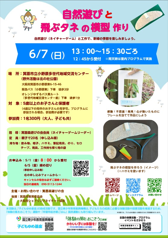 HOME » 自然保護イベント案内 » 6月自然保護イベント案内 » 箕面森遊びの会「自然遊びと飛ぶタネの模型作り」