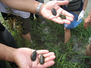 ![]() 手探りで貝を採集 | ![]() イシガイがたくさん採れました。 |