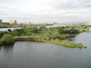 ![]() 菅原城北大橋から見た城北ワンド群。 このあたりには、05年には7000羽、06年には3400羽、今年は1500羽のツバメが集まっ た。5年ほど前までは、夕方にはツバメで空が真っ黒になったという。 | ![]() 中州が森林化し、ヨシ原が衰退。 | |