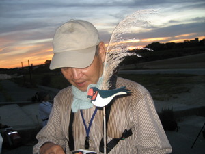 ![]() 中野先生。「ツバメの重さは、成鳥でも20gぐらい。今年巣立った若いツバメは15gぐらいです。ヨシの先にこのように止まって眠ります。」