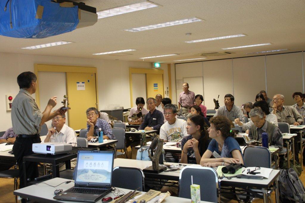 ![]() 関先生の説明を熱心に聞く受講生。 鳥の視力は人の5〜6倍も良いそうで、また、鳥の体温はふつう40度ぐらいといわれ、”ウタスズメ”は約44.6度もあったそうです。 |