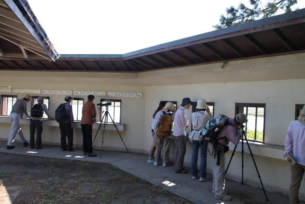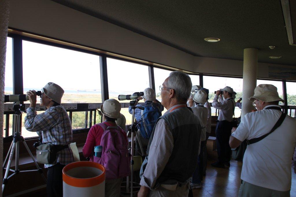 ![]() 展望塔から西池方面を観察する受講生。 “カワウ”、“シギ”、“コサギ”、“アオサギ”、“ミサゴ” 等を観察することができた。 |