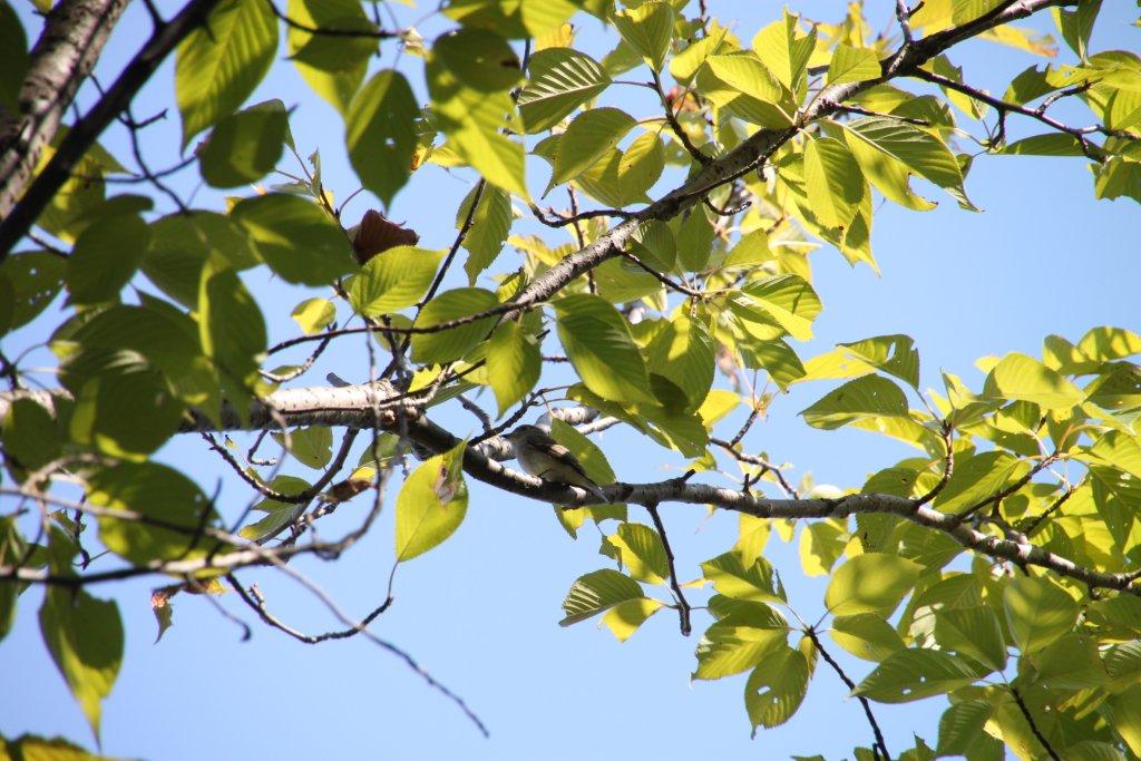 ![]() 見えたのは、“コサメビタキ”や“エゾビタキ”。“コサメビタキ”(写真)は見通しのよい枝に垂直にとまり、飛んでいる昆虫類を空中採食し、再び同じ枝に戻る。 |