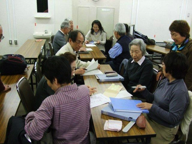![]() 講座終了後の班会議の様子・1班。「生物の話ですが、すべからく人間社会と重なって聞こえてきます」。 |