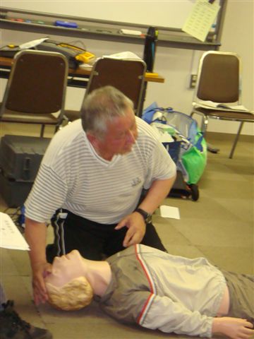 ![]() AEDも使いながら、蘇生法の練習。 「肺活量と体力が必要なのを実感させられた」と受講生。 |