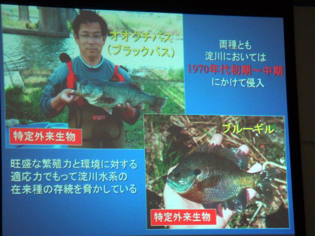 ![]() 在来種の魚を食べる特定外来生物のオオクチバスとブルーギル。