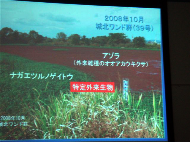 ![]() ワンドの水位が上がるなどの撹乱が無い為に、植物の外来種もその繁殖力で在来の生物を脅かす。