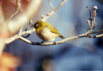 11.5cm "山椒は小粒でもピリリ"というのはメジロのためのことば。甘い声とかわいい容姿の持ち主だが、気性はきつい。餌台では自分より大きいウグイスを追い払い、スズメと互角の勝負をする。