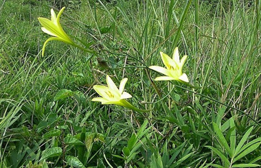 盆休みの山歩きで初めて「ユウスゲ」に出会いました。毎年何回かここに出かけますが夏は初めてでした。 この場所はやや海抜200M前後の平坦で湿気のある狭い草原です。付近には、「ヌマトラノオ」が咲いています。また 花が終わり種をつけた「花しょうぶ」や湿地の雑草も観察されます。