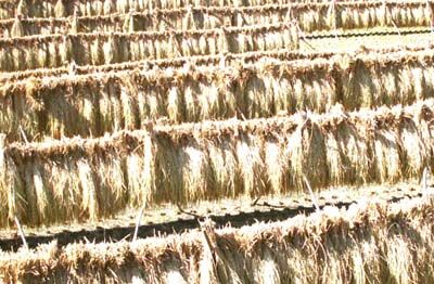 地元の須波麻神社の「おおとんど」(1月15日頃)のためにわらを残すために地元 の人たちが、残しています。11月初めには「稲こき」されてしまいます。見る方は 急いでください。昨年歩行路ネット調査中に見つけたスポットです。