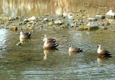 この冬、余野川の水鳥が例年になく少ないのは多分水量が少ないためだと思われます。本流の猪名川に行くと水量が多く水鳥もまずまず渡来しているようです。この日最も多かったのがヒドリガモの40数羽、次ぎに多かったのがこのカルガモです。カルガモたち何やらお喋りをしているみたいですが、別に声は出しておりません。