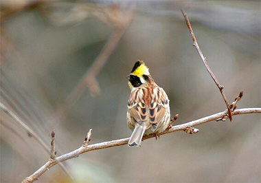 人通りがほとんどない傾斜地の畑を通りかかったところ、ホオジロとこのミヤマホオジロが驚いて一斉に近くの木々に飛び立ちました。それまで草の穂などを啄ばんでいたのでしょう。私の出現に驚いて逃げたのです。小枝に留まってからは辺りをきょろきょろと見回し安全を確かめています。私がじっとしているとしばらくして地上に舞い降り再び採餌をはじめました。