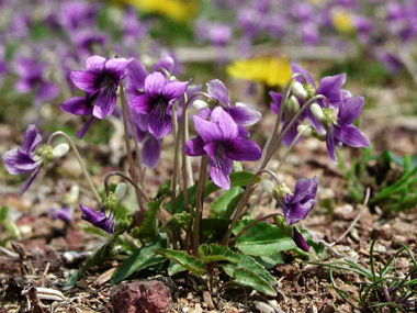 畑の傍らの草むらの中でスミレの花が咲いていました。その後に、タンポポの黄色が、スミレの青紫の色を引き立たせるように開いていました。 暖かい春の陽光の日差しの中で、どこからか「スミレのハーナーサークーころー……ー」と、宝塚のテーマソングのようになっている懐かしいメロディが、聞こえてきたような気がしました。