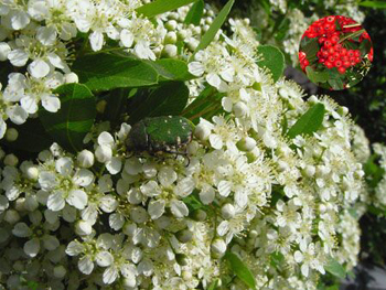 ピラカンサ「だれか来ないかなあ」 ハナムグリ「プーンといい匂いがするぞ。何処だ。木全体が小さい白い花でいっぱいだ。大きな綿菓子みたいで美味しそう」 ピラカンサ「来てくれてありがとう。さあ、たくさんたくさん、お腹いっぱい召し上が れ」
