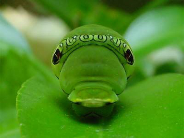 さて、このワタシはダレでしょう。 3日前までは黒い、ちょっとこわい顔でした。 今は、体長30mm、グリーンでかわいい顔でしょ。 ユズの葉をたくさん食べ、あと1週間でサナギになります。 それから、アゲハになって大空へ飛び立ちます。