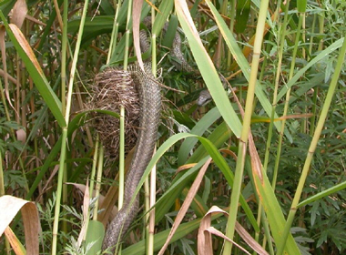 7月19日、枚方。御殿山の淀川河川敷で、昆虫の調査に参加したとき、ヨシの茂みでヨシキリが悲しげに鳴いていました。 ヨシを掻き分けて近づいて見ると…ジャ〜ン… 巣の中は、すでに空っぽでした…。 蛇びいきの私ですが、さすがにヨシキリに同情しました。