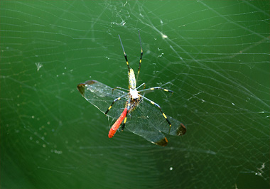 観察途中林縁を歩いていて悩まされるのがよく顔に引っかかるクモの巣。昆虫たちも同じなんでしょう、いたるところで捕らえられています。 小さな昆虫以外にもトンボ、セミ、蛾など大型の昆虫が結構引っかかっています。 このリスアカネの雄、この少し前に捕らえられたようです。