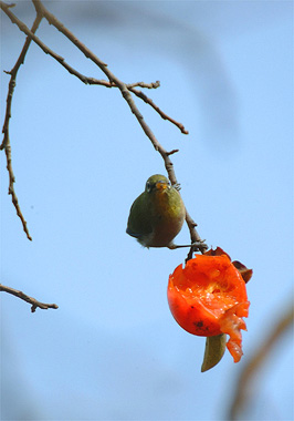 他の柿の木にはまだ多くの実をつけているのに、ここの実はほとんど無くなっている。残り少ない熟した柿をまるで独り占めして味わっているかのようです。