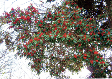 朝日に照らされたもちの実が葉の下にかくれきれないぐらいたくさんついて。 赤い鳥が食べたのは、きっとこの実だ(?)・・・。
