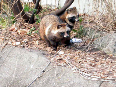 タヌキは2匹。つがいでしょうか、仲よくじゃれている姿も見れます。通学途中の女子高生がパンなどを与えているのか、ほとんど警戒心なく、時々すぐ近くまでやって来て、こちらの様子をうかがったりします。