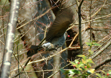 ほとんどの木の実が鳥に食べられた後、まだ残っていたシナヒイラギの赤い実を、今日はツグミとヒヨドリが群で食べていました。見ていると、ヒヨドリの採食方法はシナヒイラギの近くの別の樹の枝に留まり、そこから実めがけて飛び立ち空中で実をくわえ採り枝に帰ります。そこで実をあらためて咥え直し飲み込むのです。